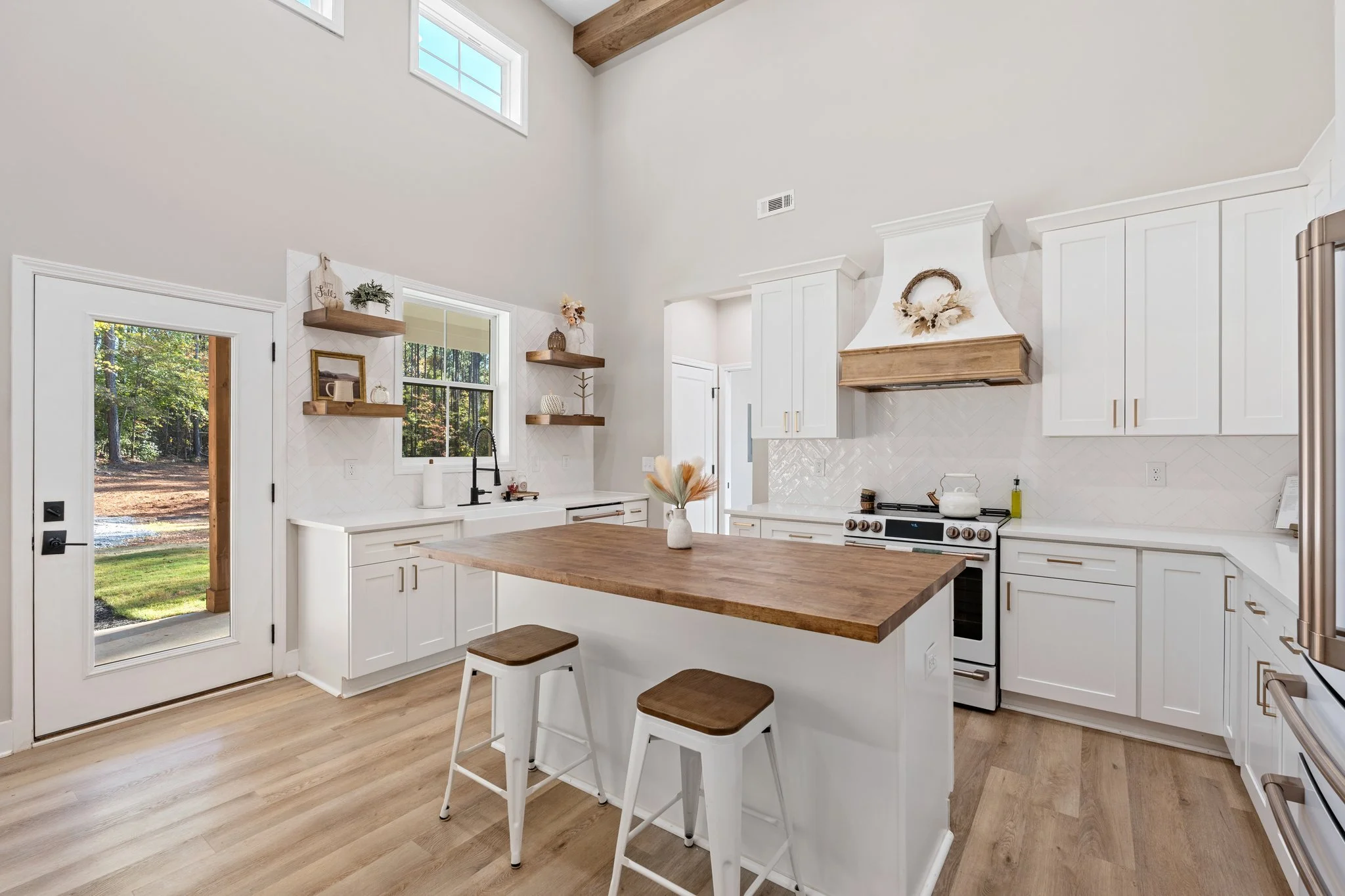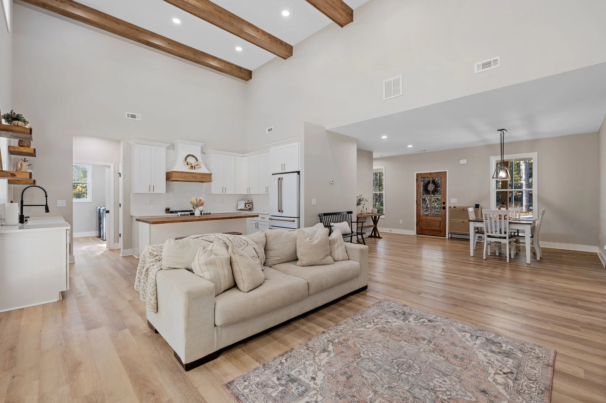Welcome to this charming white farmhouse, perfectly nestled in a peaceful setting. With a solid concrete slab foundation, this home exudes both stability and rustic appeal. Step inside to discover a bright and airy open floor plan, highlighted by vaulted ceilings adorned with stunning wood beams, creating a warm and inviting atmosphere throughout.